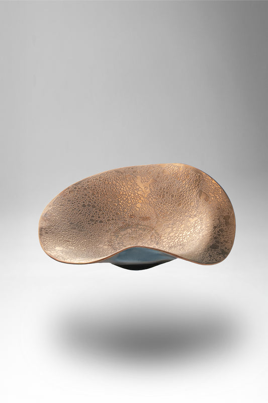 大胆なカーブと泡模様の凹凸が光を反射し、力強く輝くブロンズのうつわ。金属的な光沢が角度によって表情を変え、存在感のあるモダンな佇まいを見せます。釉薬の深みが生む陰影が上品さを保ちながら、テーブルにインパクトを添えます。盛り付けるだけで料理をアートのように引き立てる一枚です。