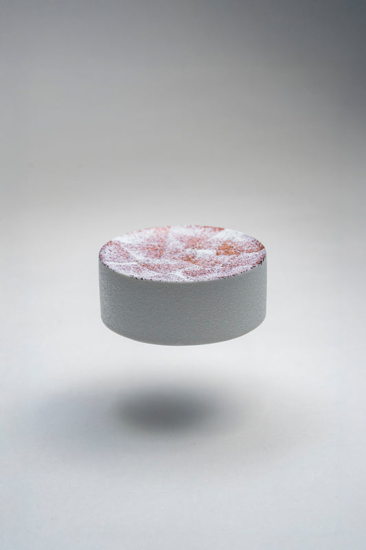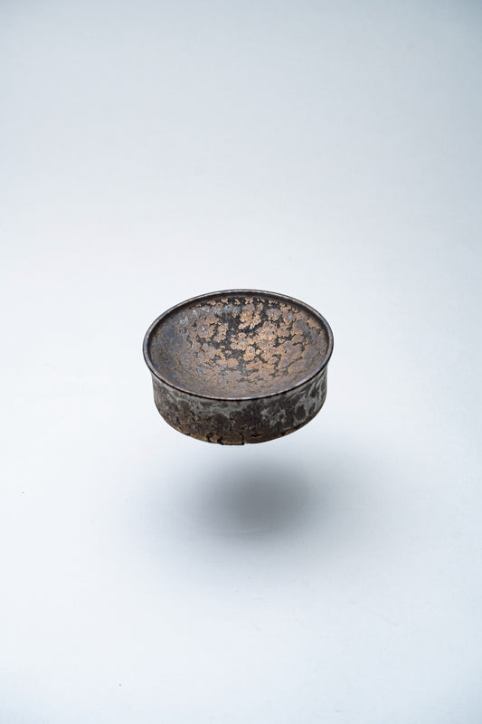 円柱を輪切りにしたような端正なフォルムに、雪のような白釉と銅の煌めきが調和したドラム型プレート。光を受けるたびに微細な金属光が揺らめき、角度によって異なる表情を見せます。滑らかな磁肌が生み出す清らかな印象と、銅の華やかな輝きが共存する上品なデザイン。Φ100のコンパクトなサイズは、酒肴やデザートの器としても映え、テーブルに静かなきらめきを添えます。洗練と温かみが同居する、美しい一枚です。