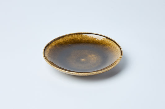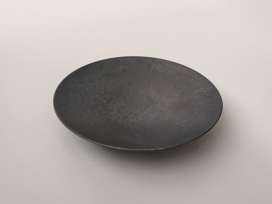銀砂によるマットな黒が静けさをたたえ、そこにブロンズの艶やかな加飾が差し込むことで、夕月の満ち欠けが浮かび上がる一枚。手割の有機的な輪郭に沿って光が移ろい、角度によってブロンズが温かくきらめきます。質感のコントラストが料理の彩りを引き締め、和洋を問わず印象的に演出。静かな余白と上品な輝きが同居する、情緒豊かなモダンプレートです。