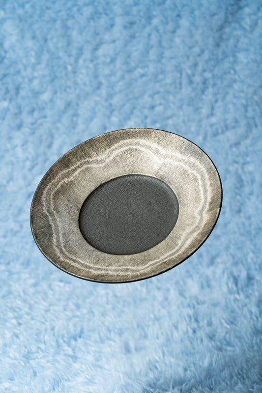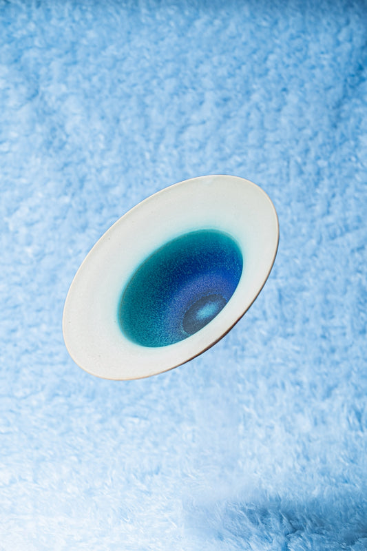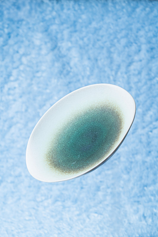 器を見た時に海のイメージが浮かびました。海のミネラルのような...海の底のような...深みのある色合いは涼やかな夏場のお料理にぴったりだと思いました。グラデーションがある器なので食べ終わってからも愛でていただける器です。常連様のリクエストで冷やし中華をこちらの器でお出ししたら「こんな豪華な冷やし中華は初めて」と感動していただけました。