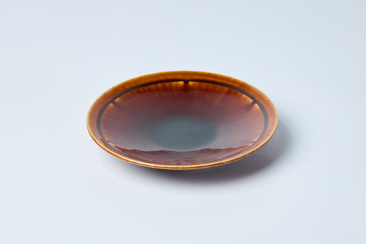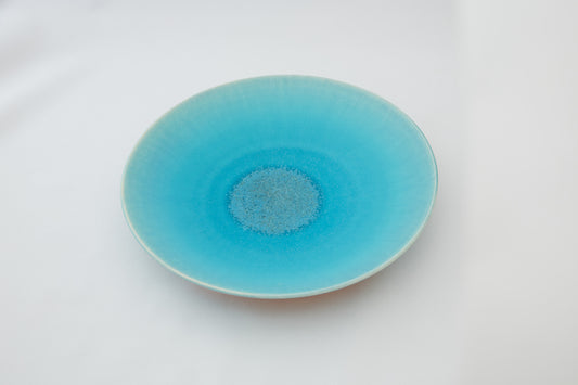 渕から中心へと移ろう青の濃淡が美しく、まるで水面に光が差し込む瞬間を閉じ込めたような一枚。釉薬が自然に流れ、中央に生まれる深みのある釉薬が存在感を放ちます。鮮やかさと透明感を兼ね備えた青が、料理の彩りを一層際立たせ、和洋問わず上品に調和。メイン皿として食卓を爽やかに引き締め、見るたびに心を潤すような美しさを添えます。