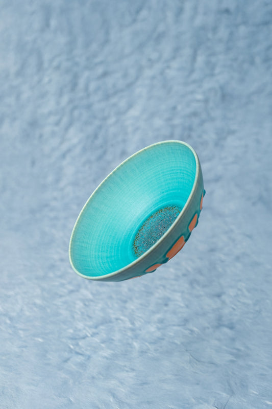 渕から中心にかけて、透明感のある青が静かに移ろう「碧彩」シリーズの小ボウル。器の内側に流れ込む釉薬が深く美しいグラデーションを描き、底に溜まった釉薬が光を受けてほのかに輝きます。小ぶりながらも奥行きを感じるデザインで、和え物やデザート、スープなど幅広く活躍。見るたびに異なる青の表情を楽しめる一品です。食卓に清涼感と静かな華やかさを添える、上品な佇まいの器です。