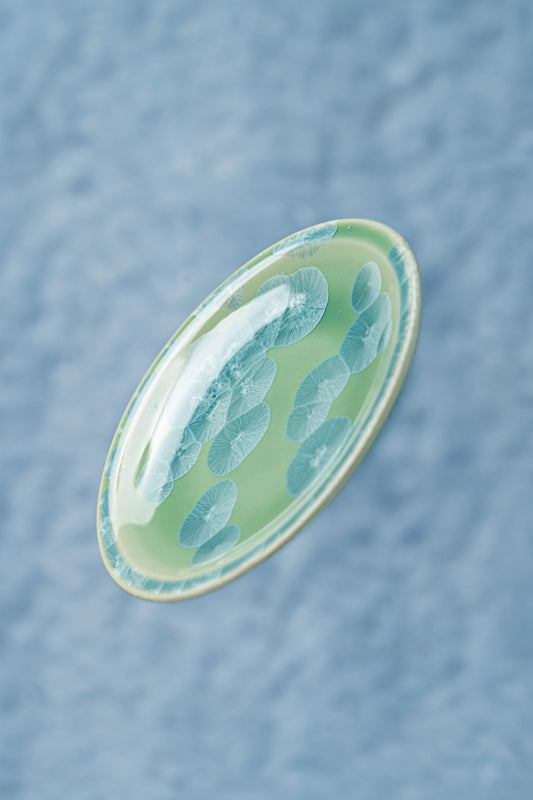 光の加減で淡く輝く、花びらのような結晶模様が美しい「花結晶」シリーズ。釉薬の中で自然に生まれる結晶が一枚ごとに異なる表情を見せ、同じ色でもふたつとして同じ景色はありません。やわらかな透明感と上品な艶が、料理や菓子をやさしく包み込み、日常の食卓を華やかに彩ります。京焼・清水焼ならではの繊細な感性が息づく、凛とした美しさをもつ器です。