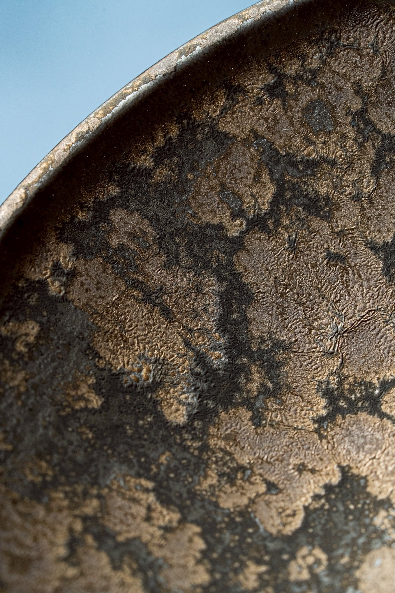 無機質な素材感が醸し出すシックな器。その風合いは鉱物と1300℃の窯の中での変化で成形され、一つとない表情、景色として表現されています。ユニークな形はお料理の幅を広げ、色んなジャンルのお料理にお使いいただけます。