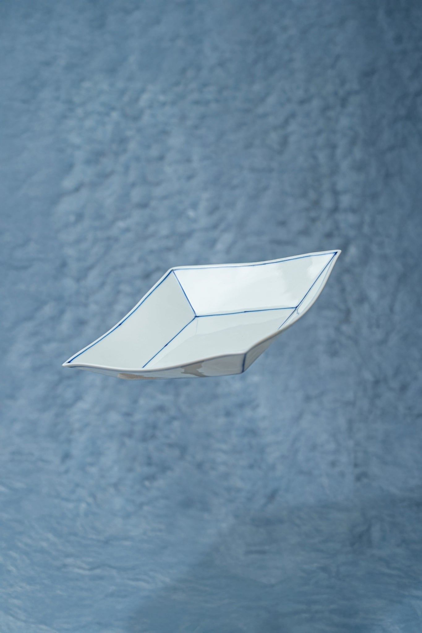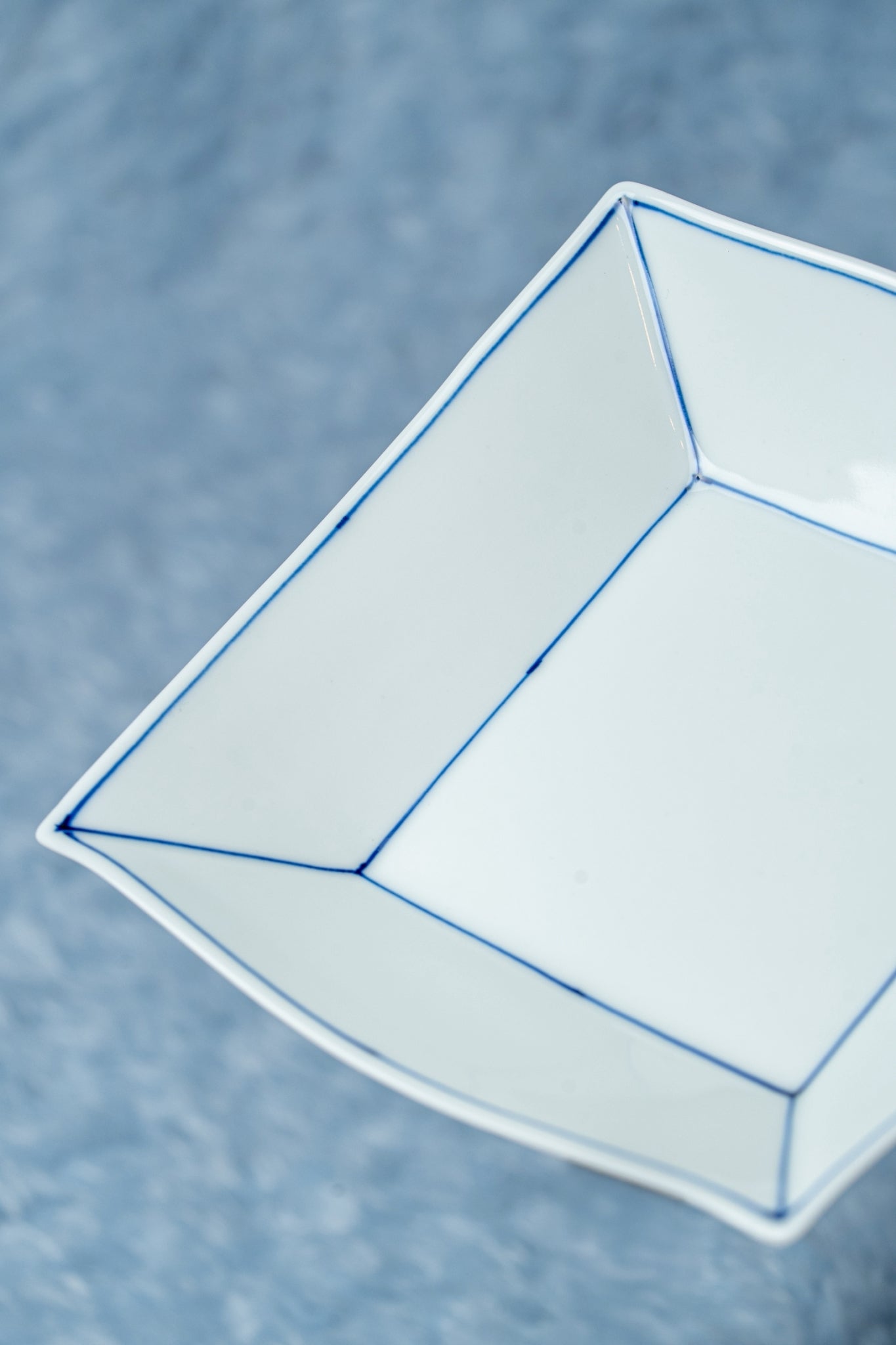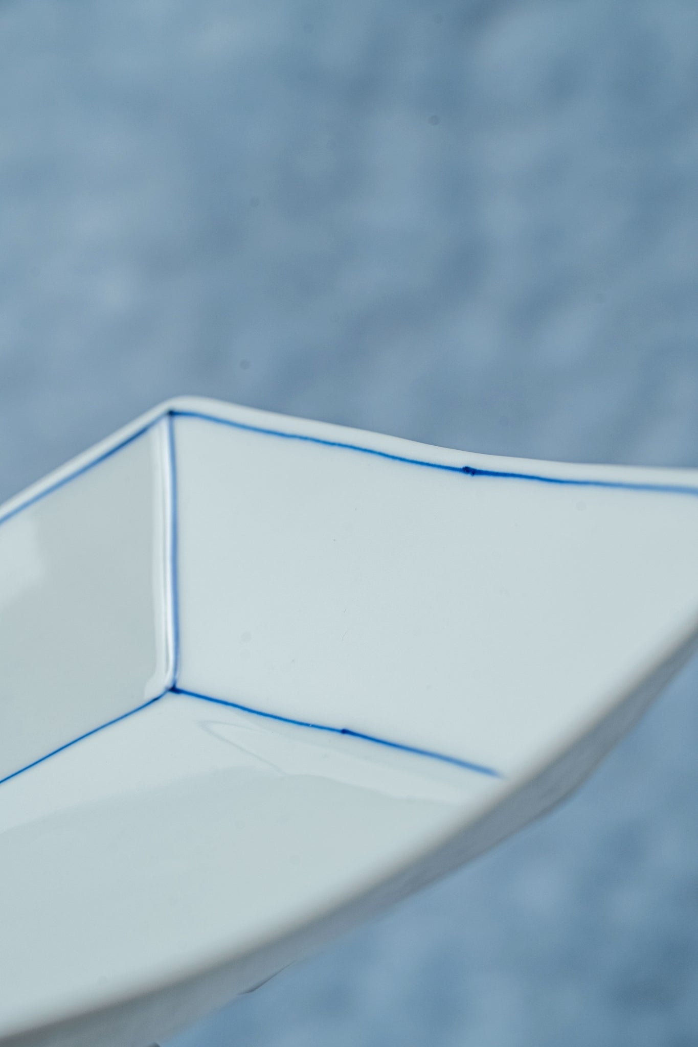 焼き上げた真っ白の器に、藍色に発色する絵具で一つ一つ描いていきます。シンプルなラインのデザインは、いろんなお料理に合う器です。