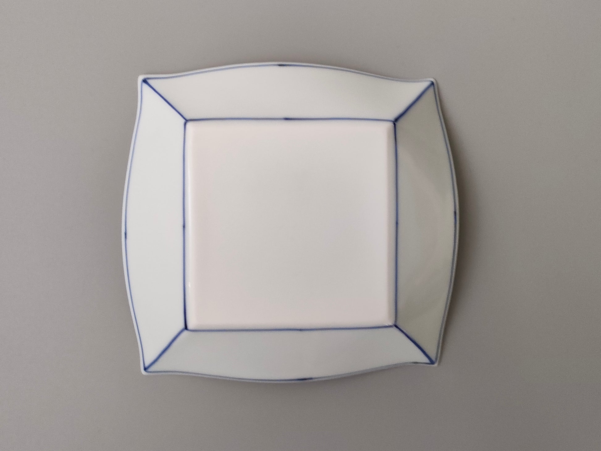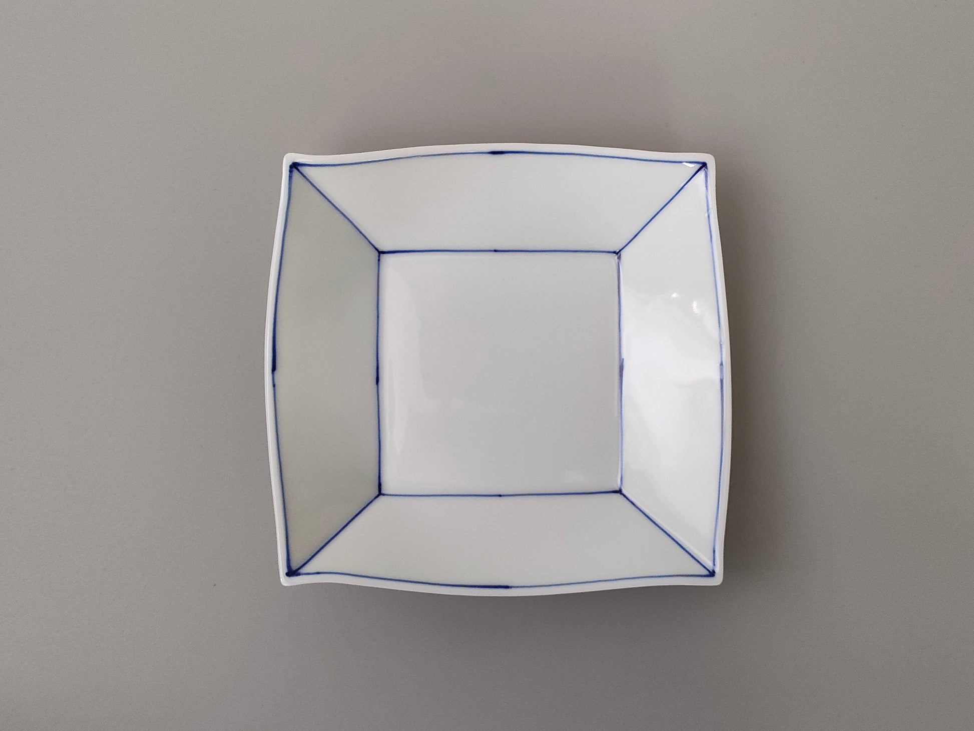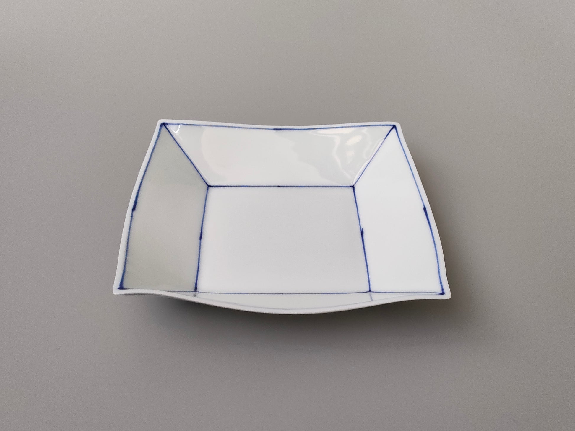 焼き上げた真っ白の器に、藍色に発色する絵具で一つ一つ描いていきます。シンプルなラインのデザインは、いろんなお料理に合う器です。