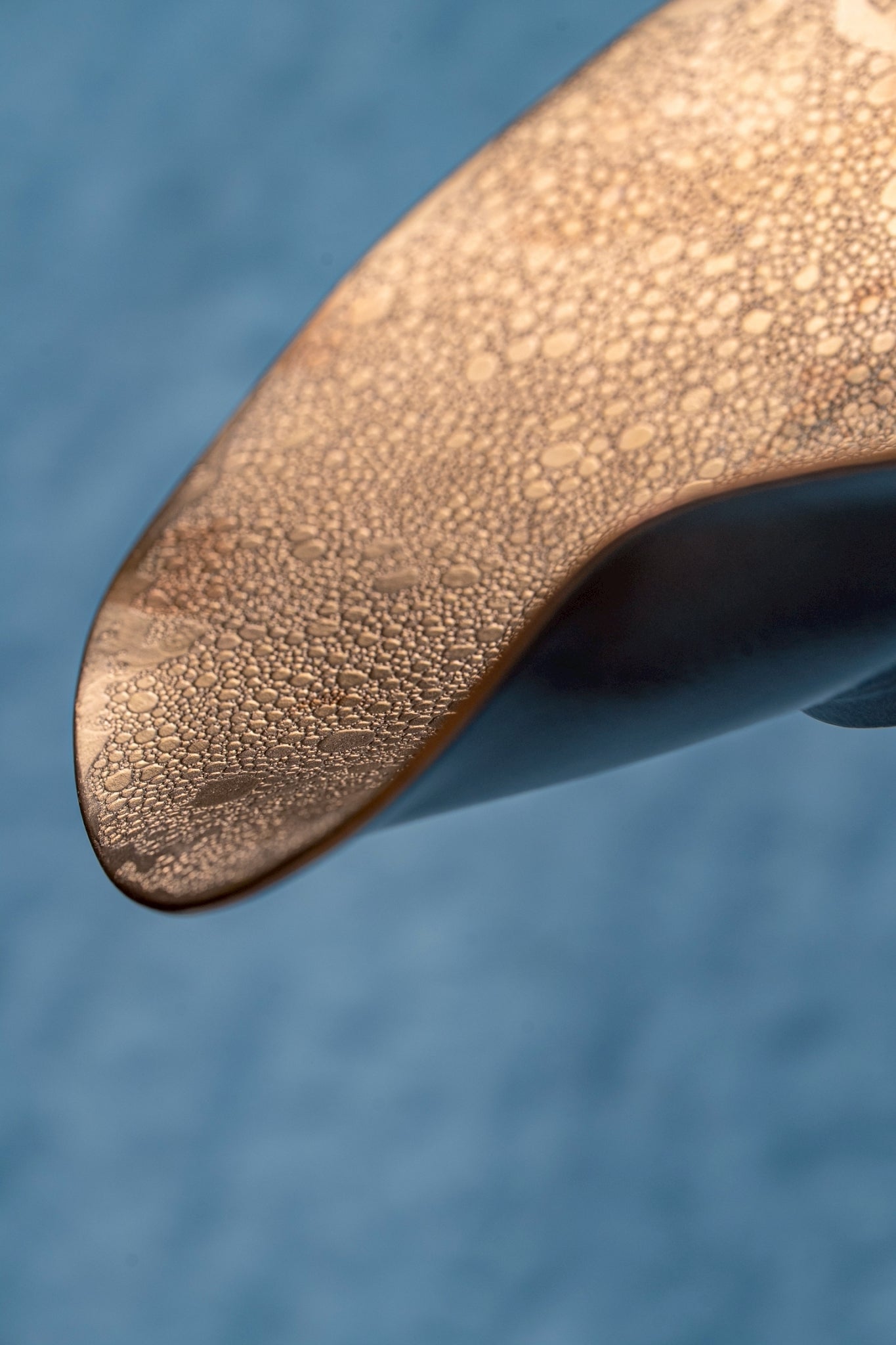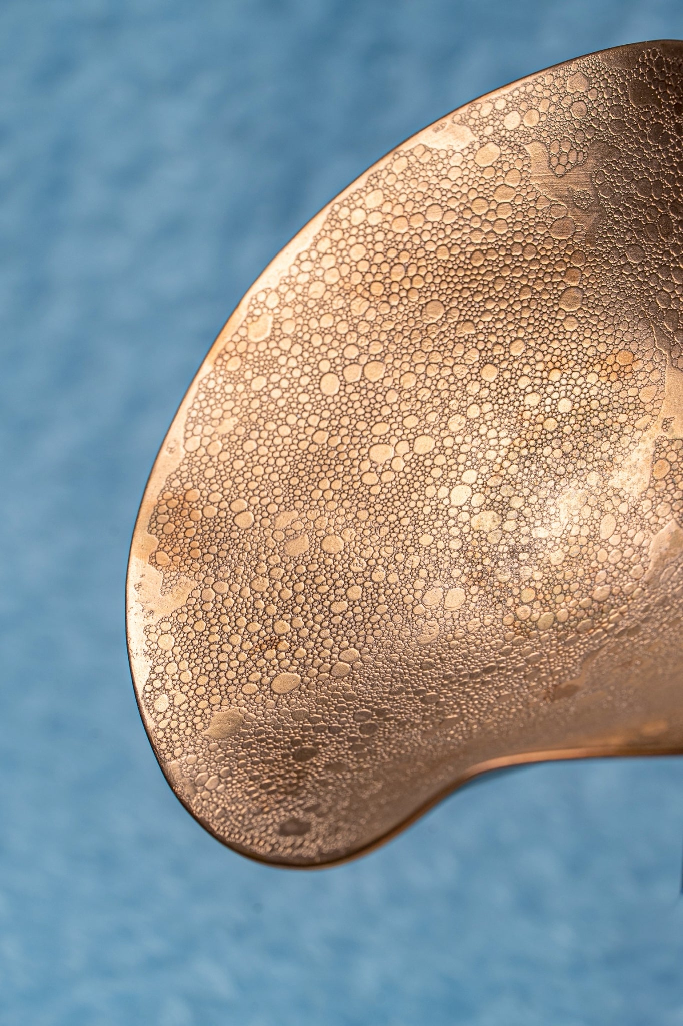 陶磁器とは思えない滑らかにカーブした形状に、泡がついたように模様がつけられた鉢。ブロンズ釉薬での表現がモダンな器です。