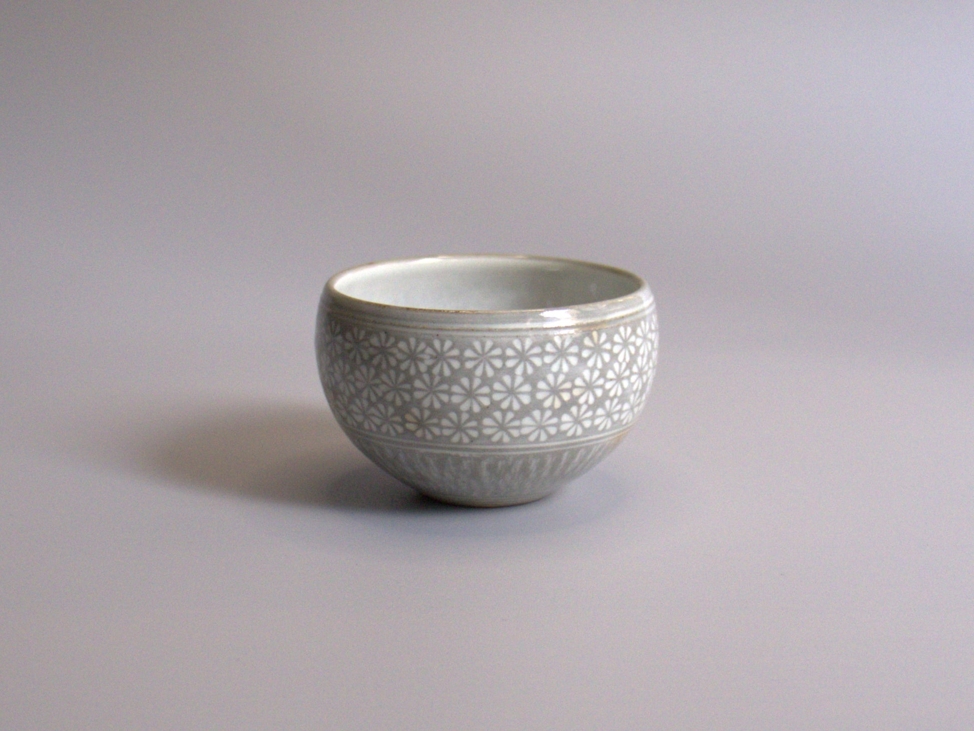 京都で学んだ装飾の技術である印花と、京焼ならではの薄造りを、伊賀焼に融合させました。ひとつひとつ手作業で施された印花文が特徴です。