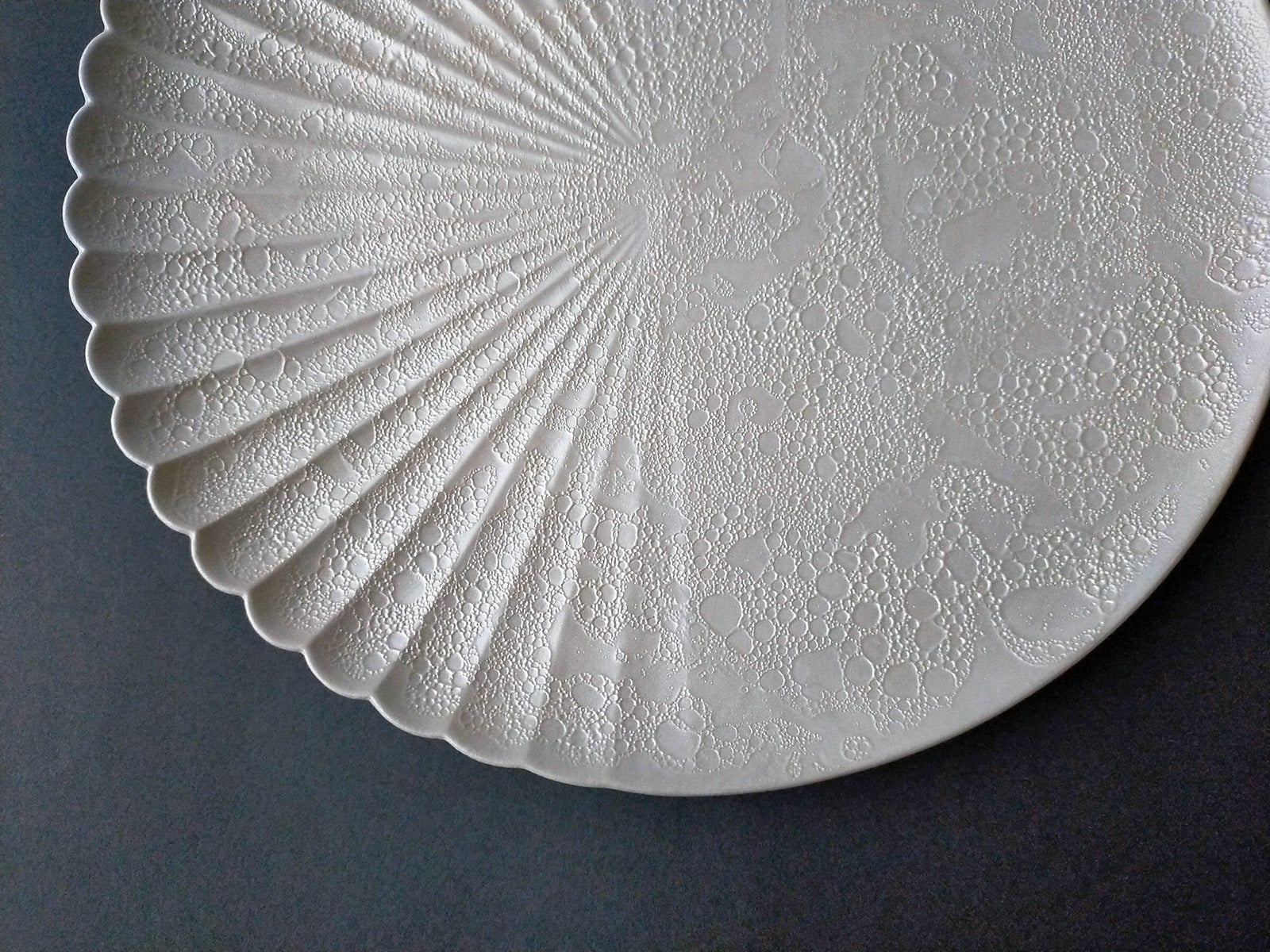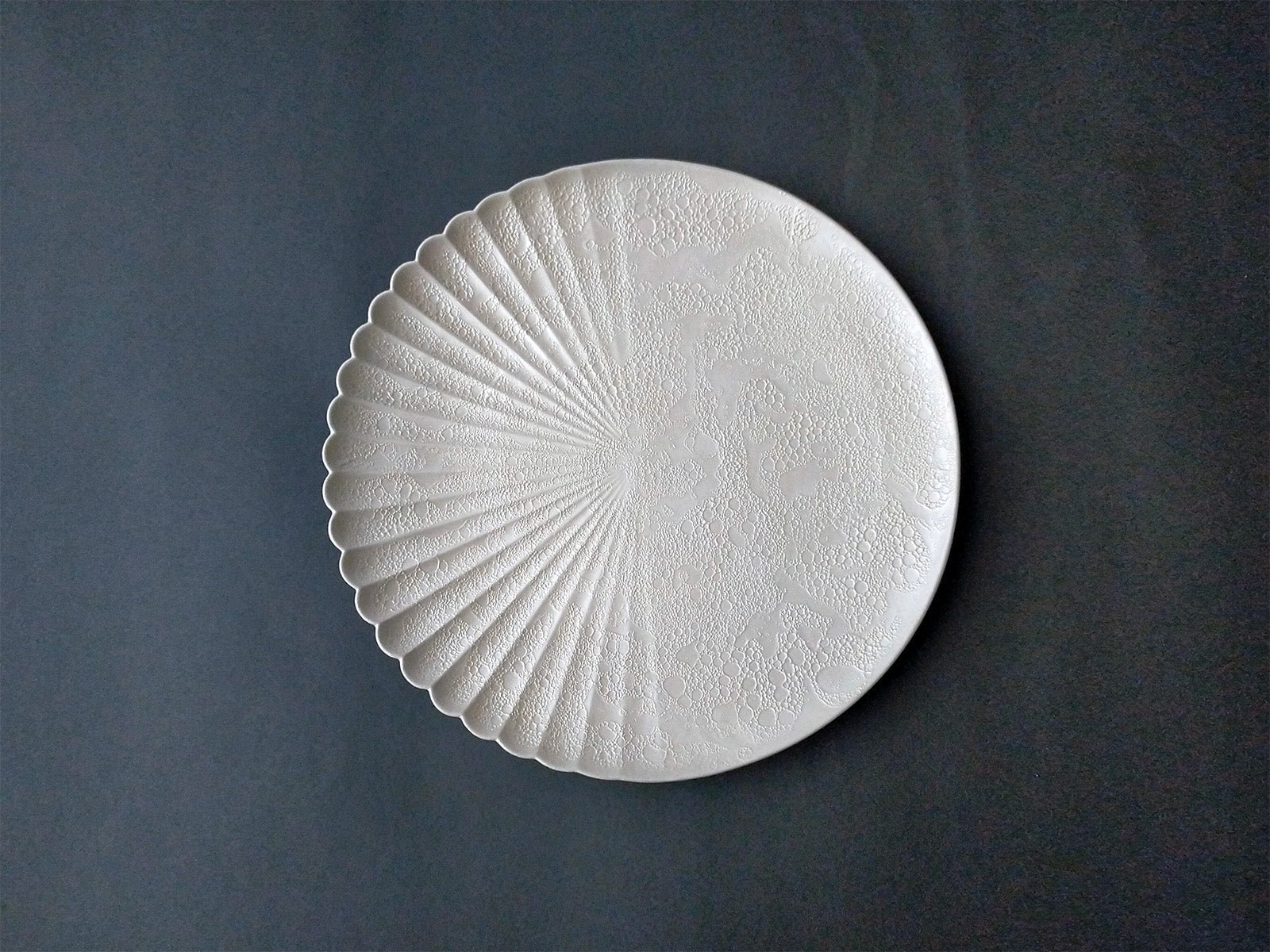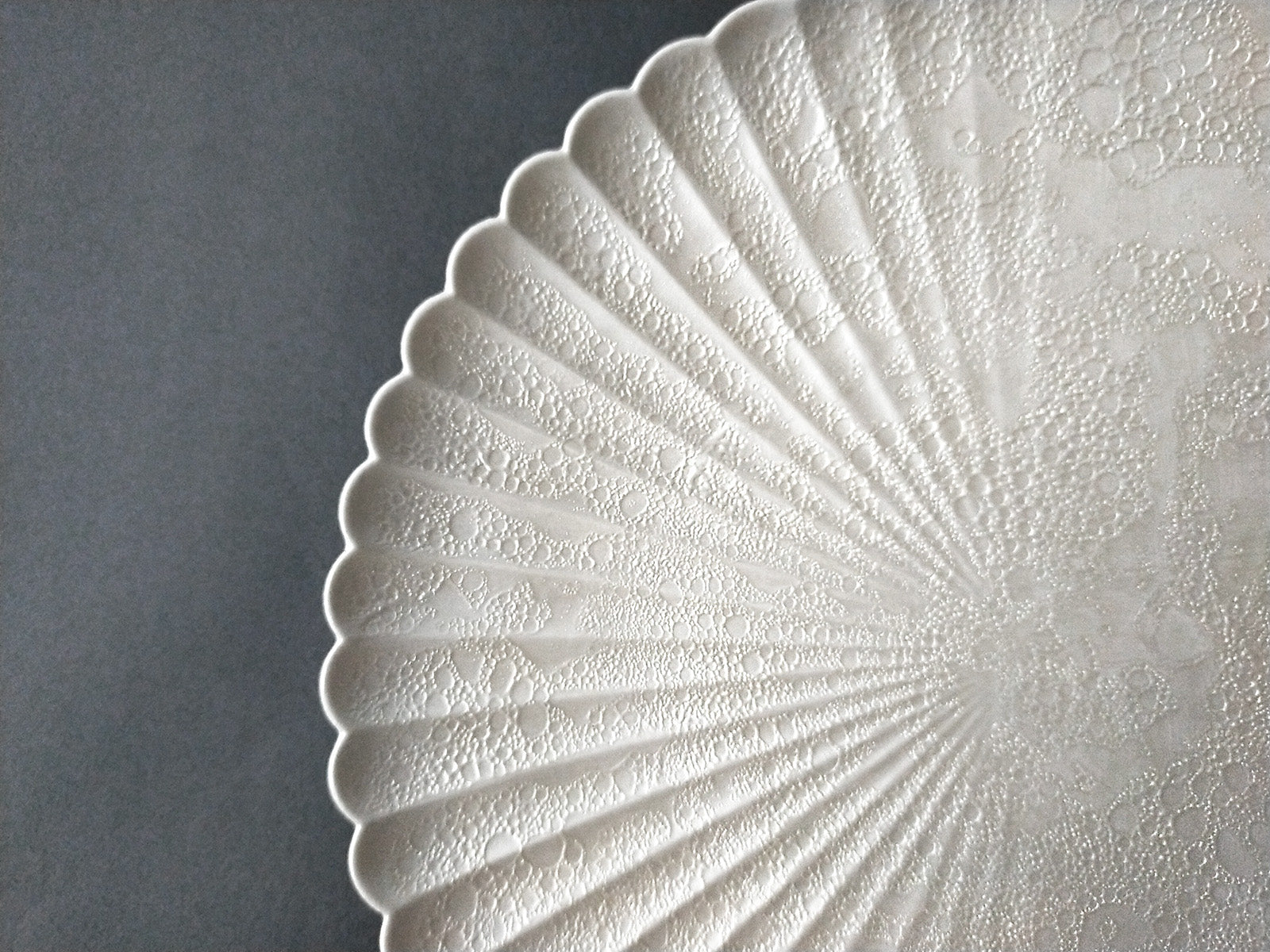 お皿の半分が菊割の形状になっており、立体感のある泡とパールホワイトの釉薬表現が、高級感を演出します。