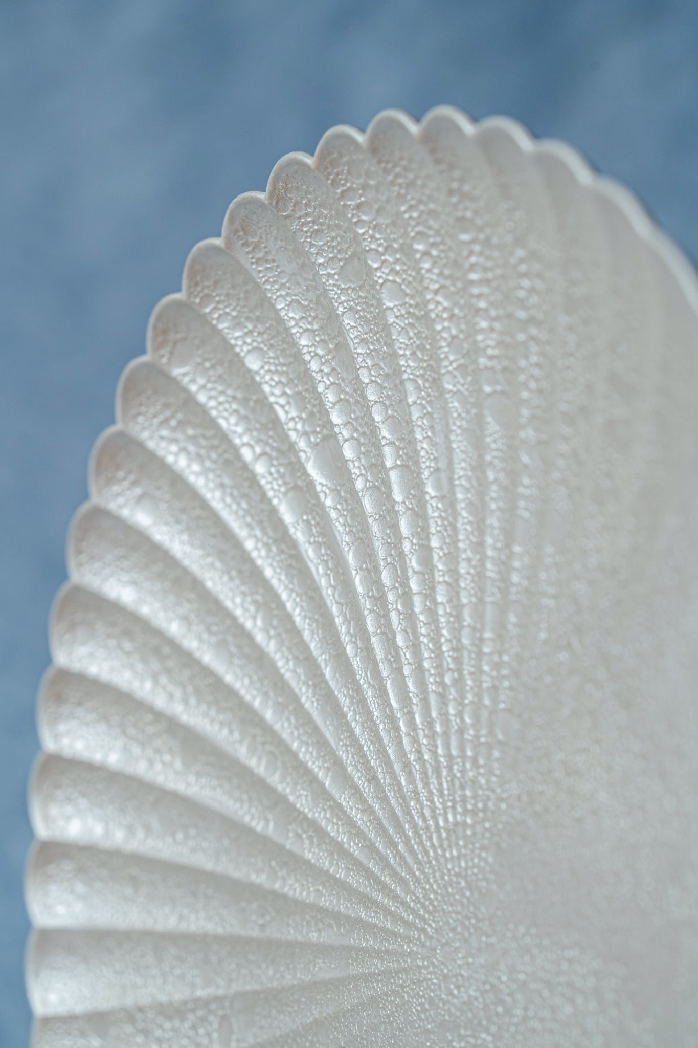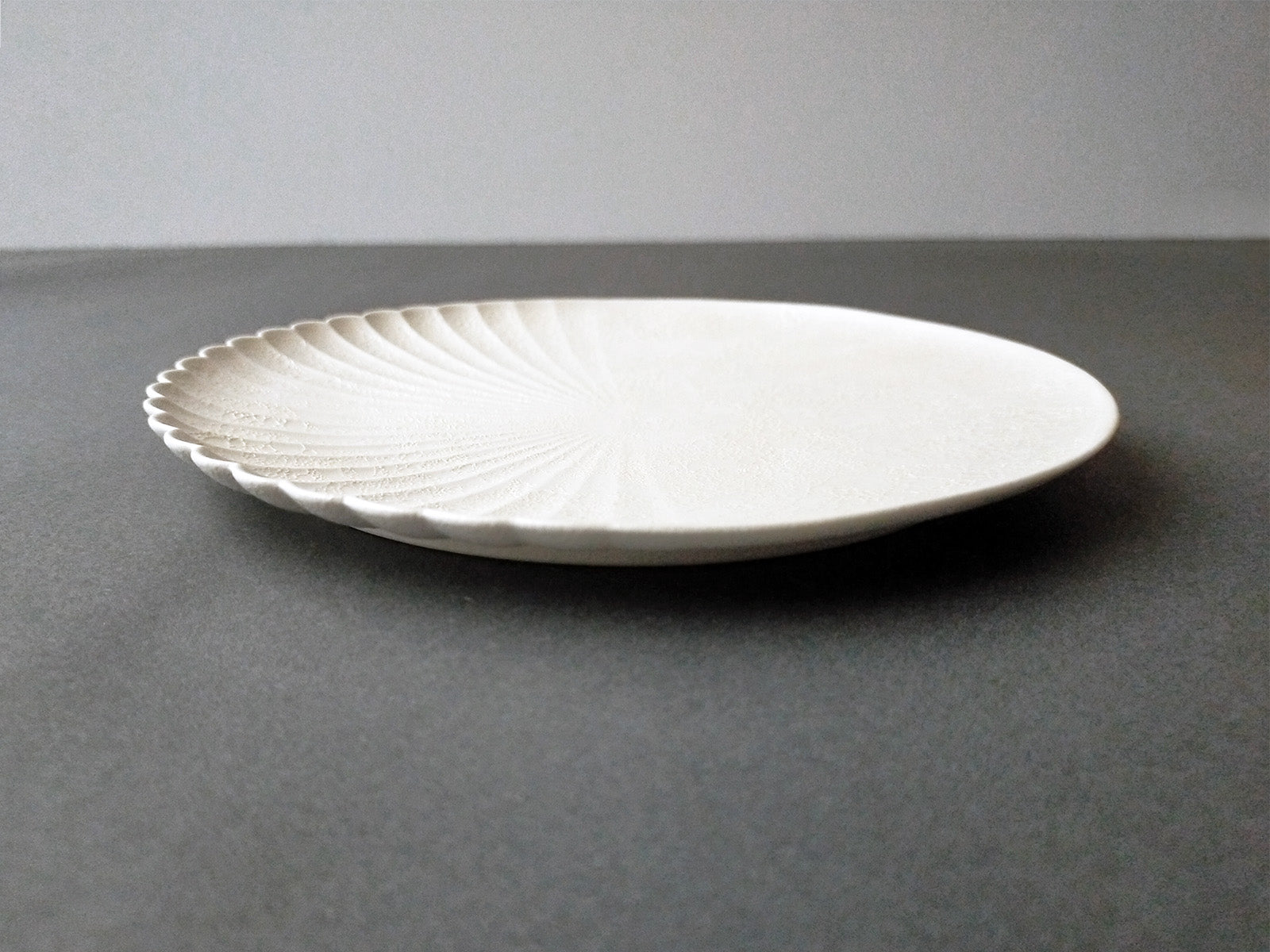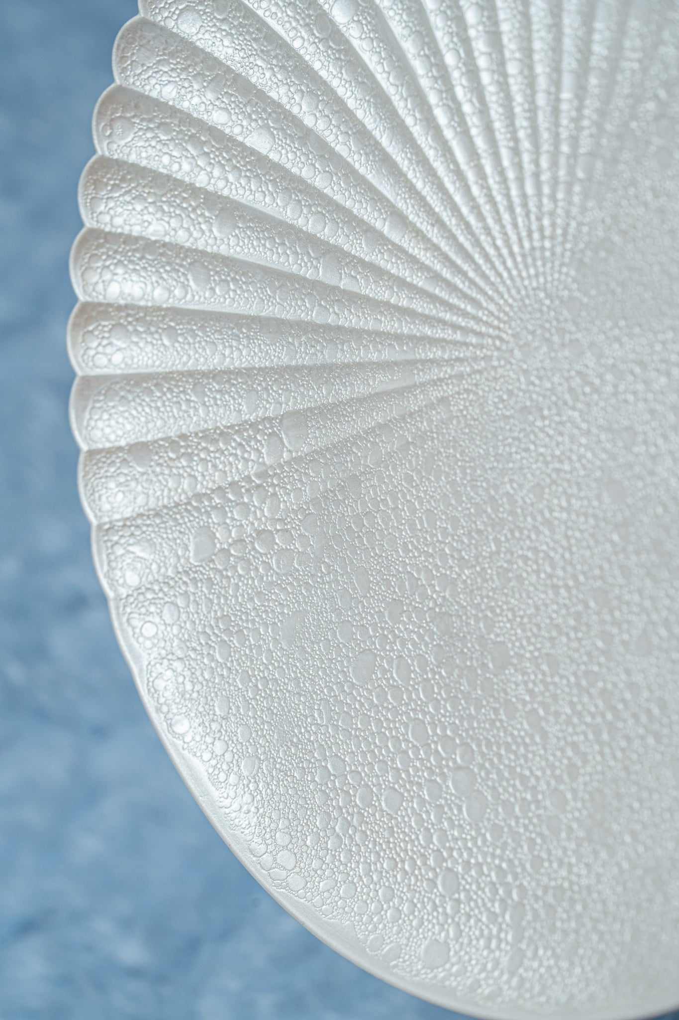 お皿の半分が菊割の形状になっており、立体感のある泡とパールホワイトの釉薬表現が、高級感を演出します。