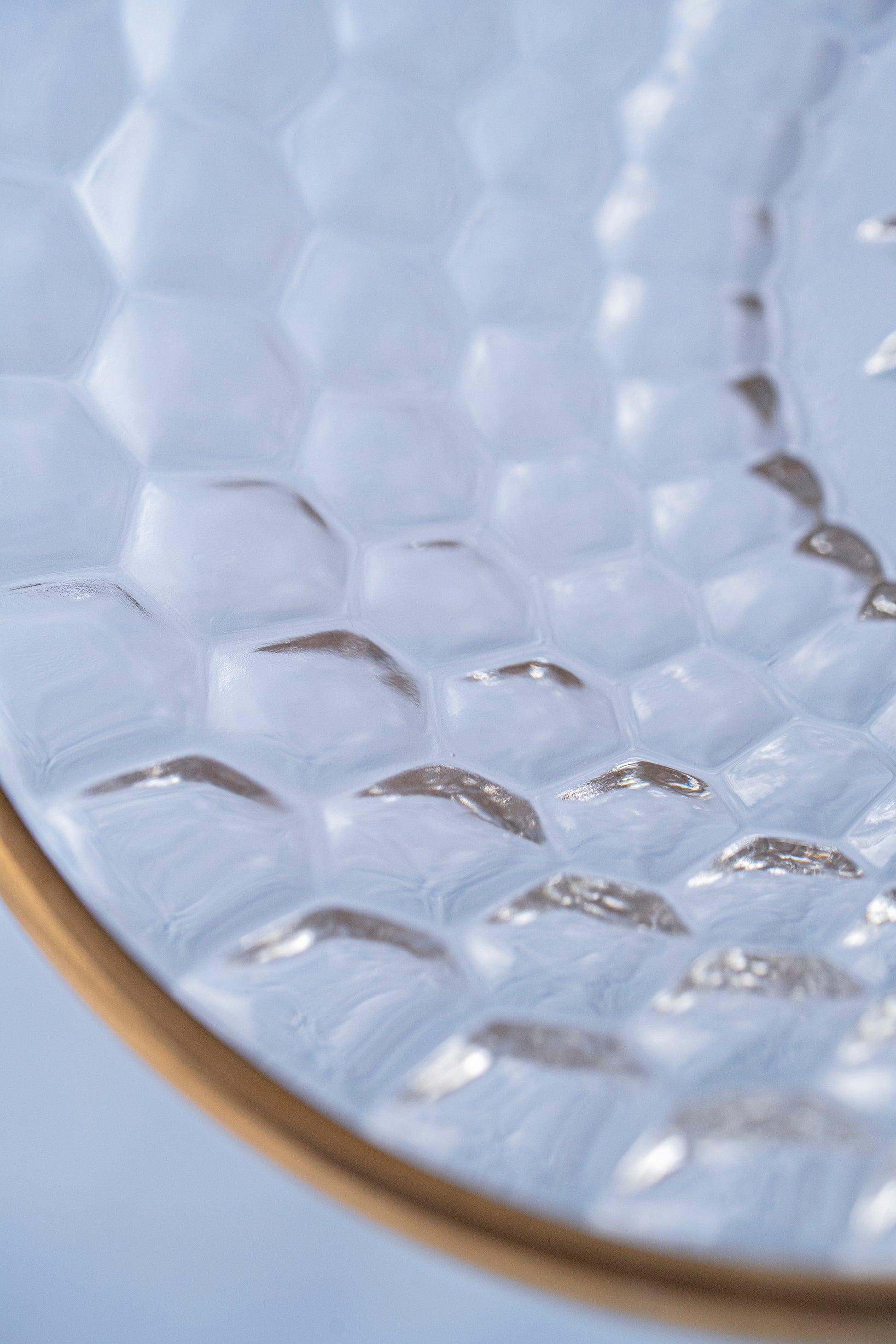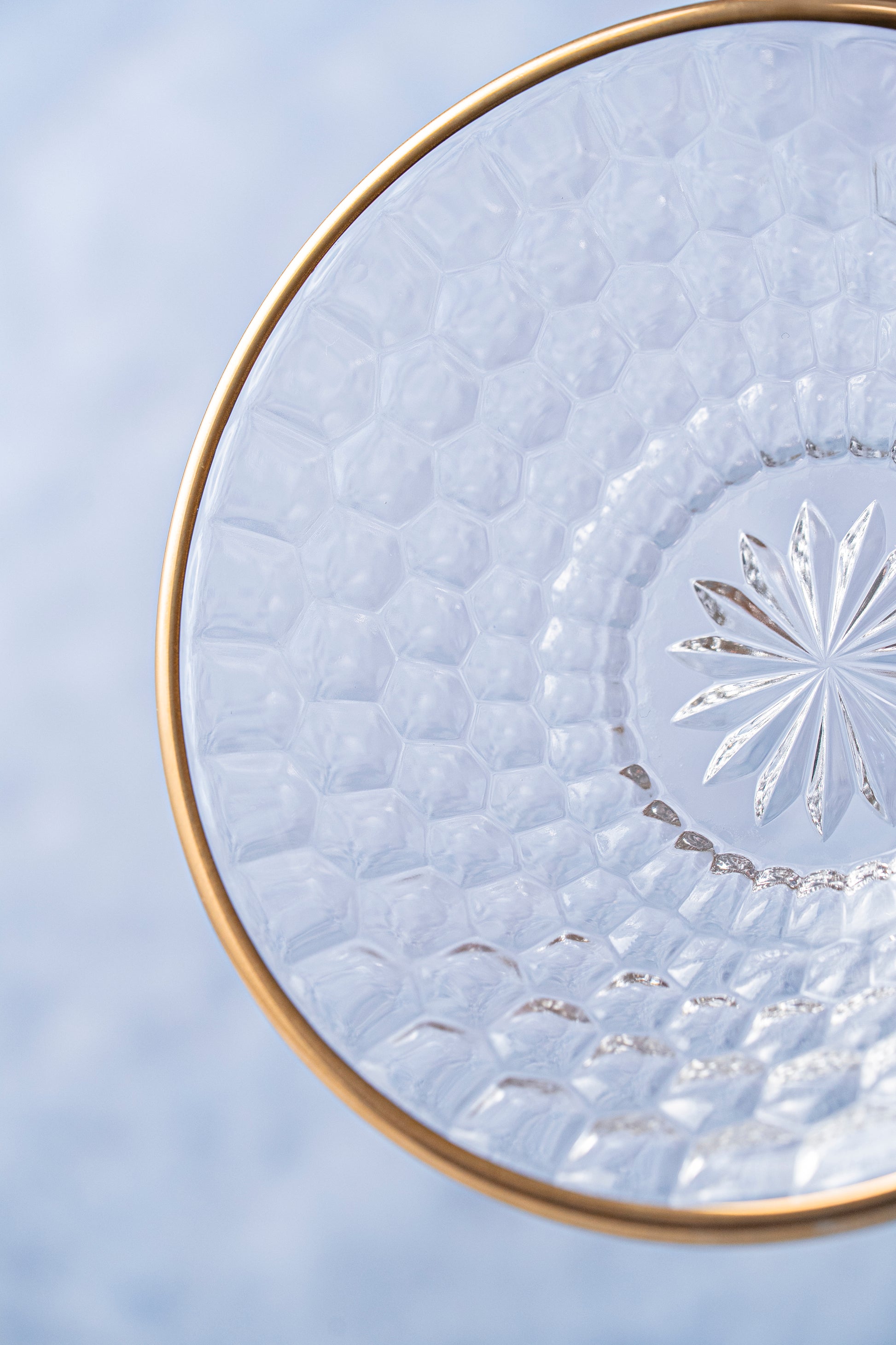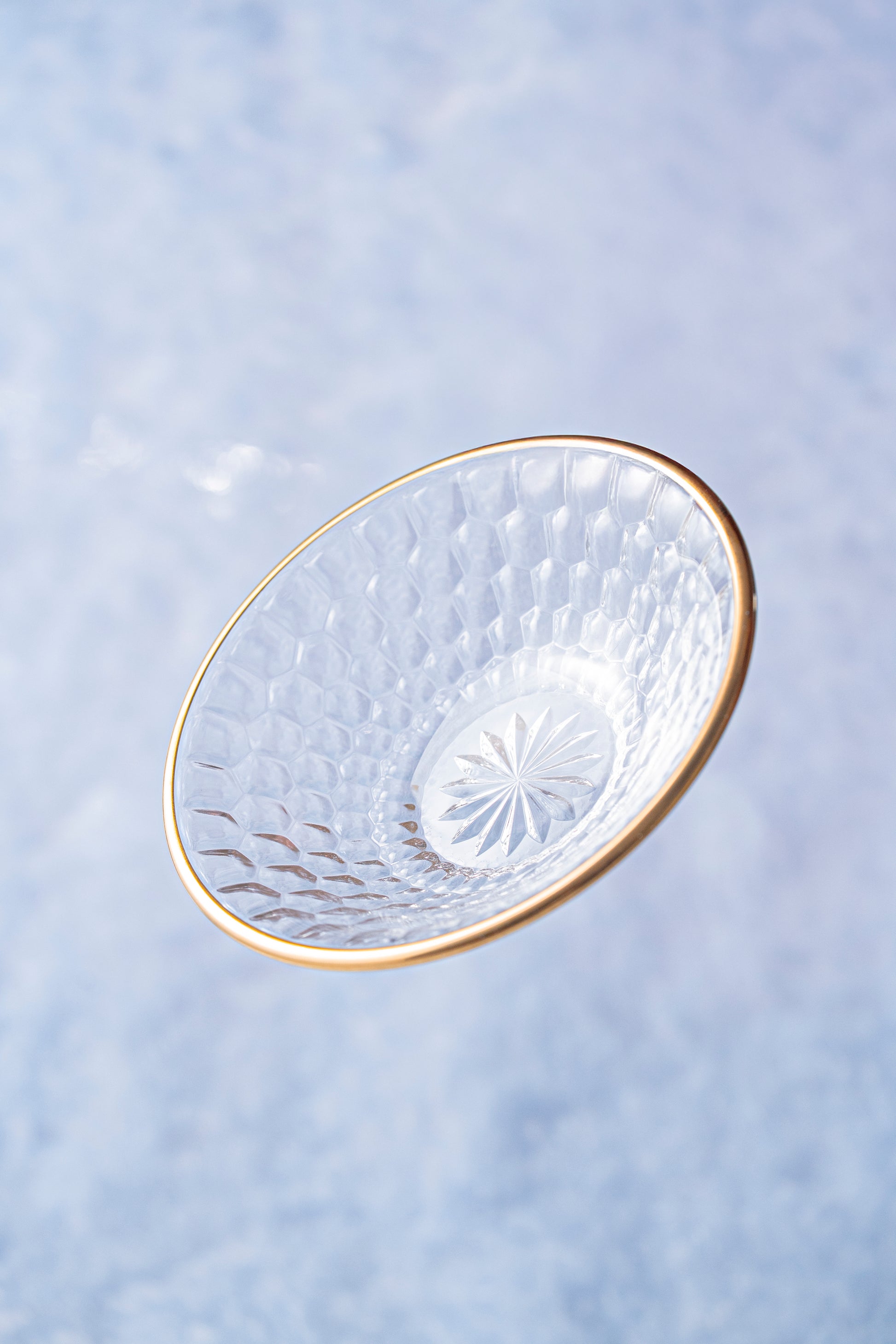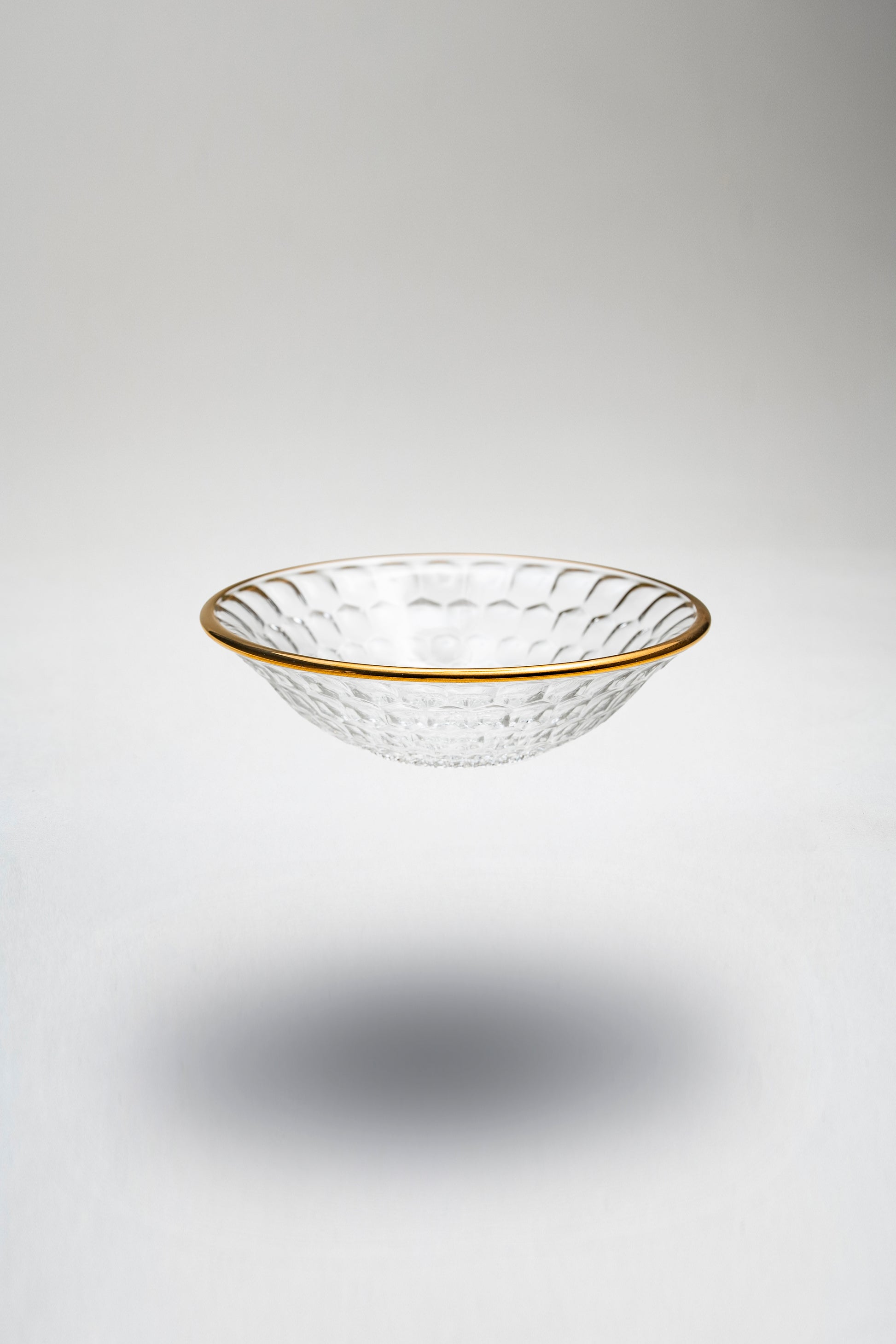 六角形の文様が美しく浮かぶガラスの鉢。亀甲を思わせるデザインが光を反射し、繊細な陰影を生み出します。縁には金彩があしらわれ、透明感の中に上品な輝きを添える仕上がりに。ガラスならではの清涼感と金の華やかさが調和し、食卓に特別な存在感をもたらします。前菜やデザート、お造りなどを盛るのにも最適。伝統の意匠を現代の感性で昇華させた気品あふれる一品です。