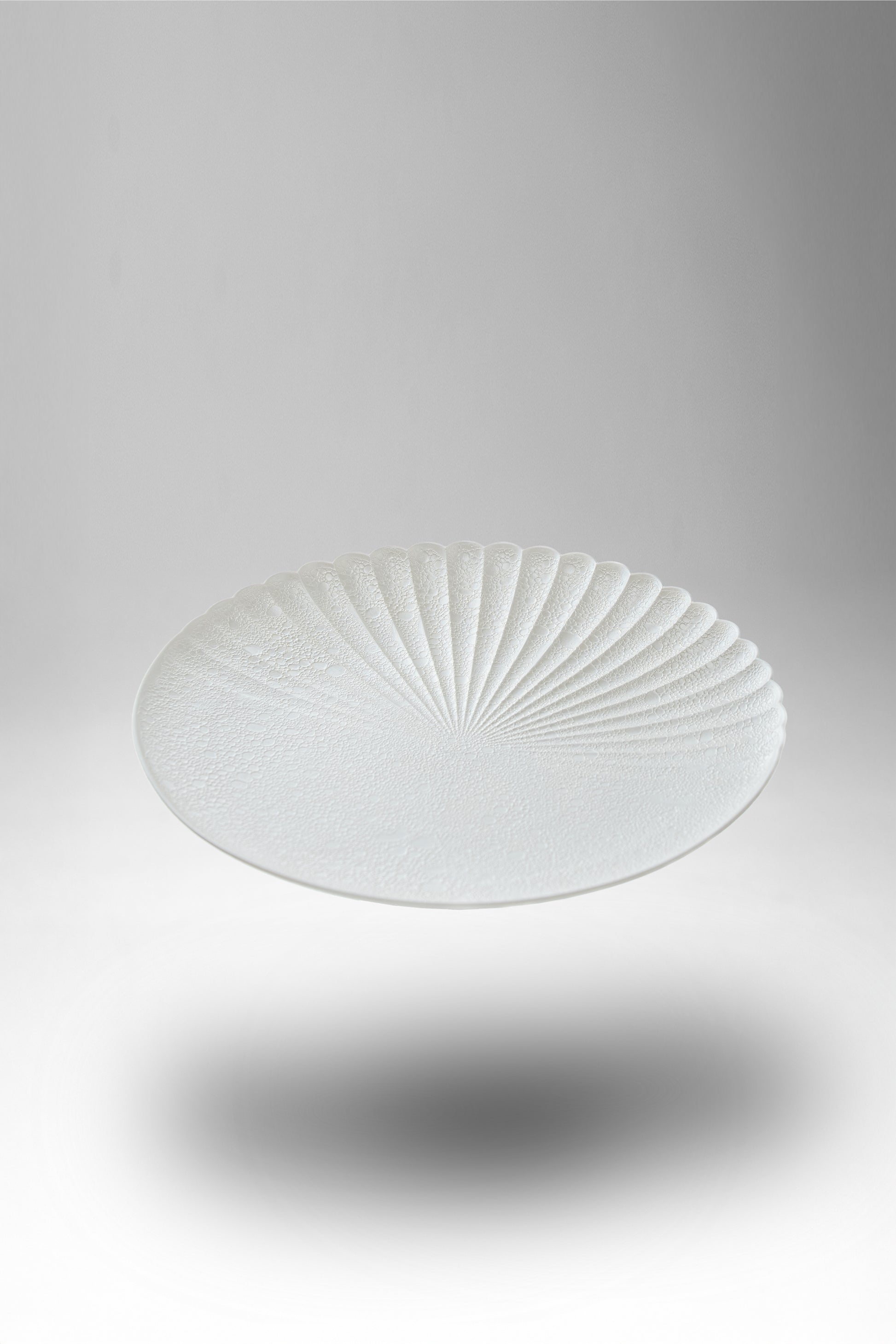 清らかな白磁に淡いパールの光沢が広がる上品なプレート。片側の菊割が光を受けて柔らかに輝き、料理を優しく包み込みます。22cmのサイズは、メインやデザートの盛り付けにも程よく、和洋を問わず美しく映える万能な一枚。清潔感と華やかさを兼ね備えたデザインです。