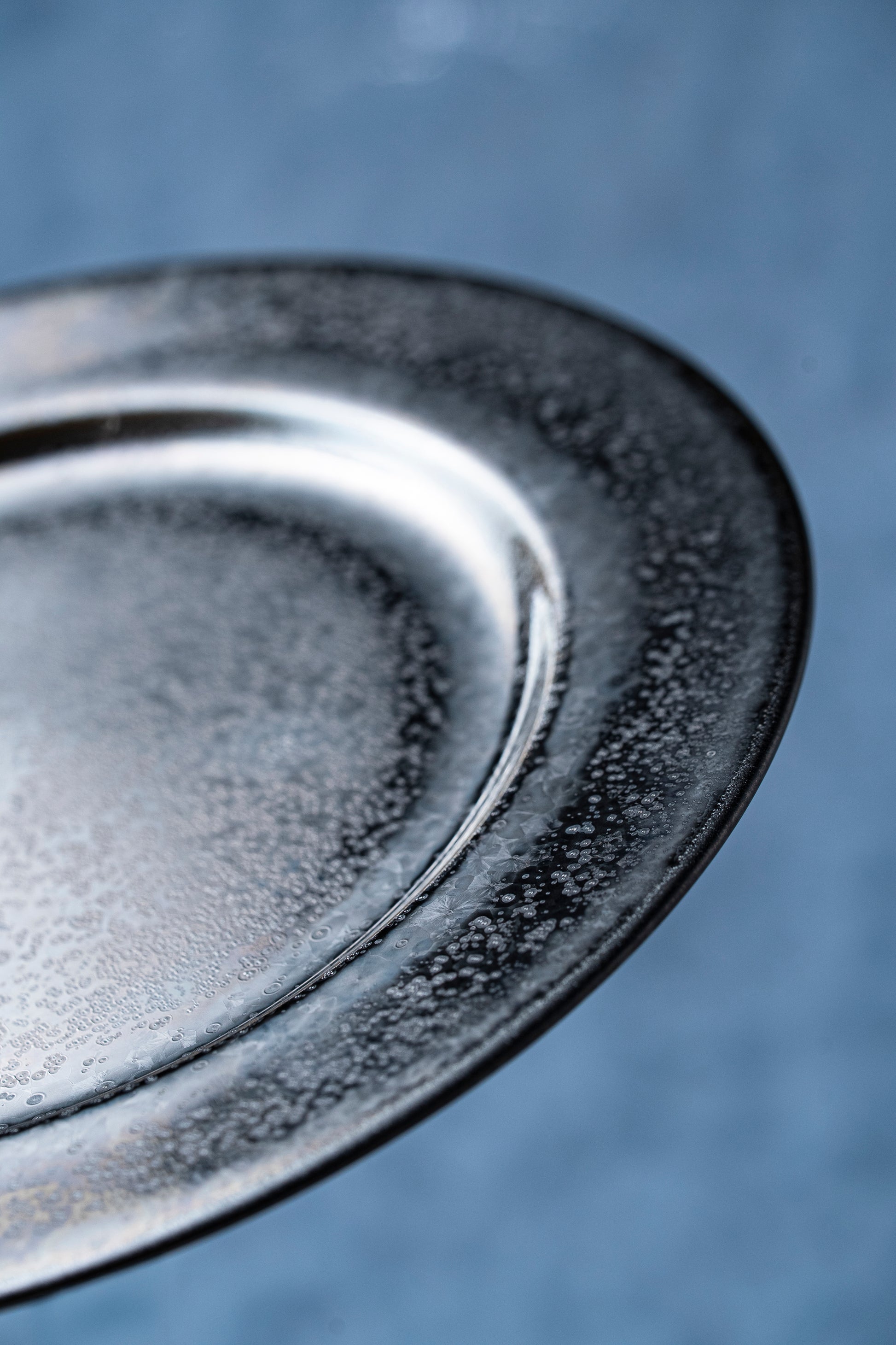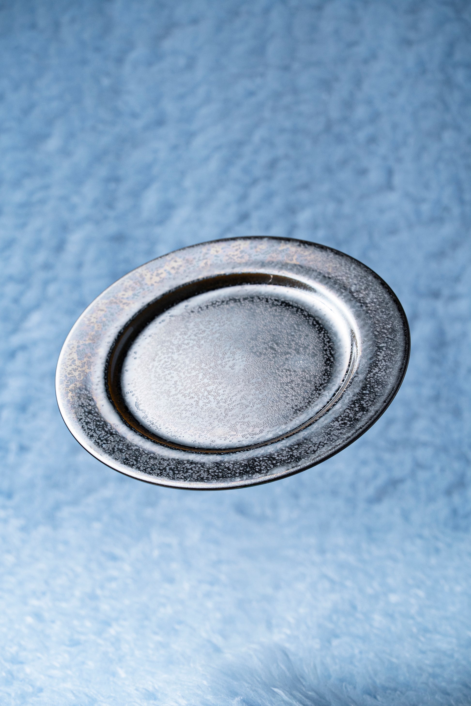 黒褐色の中に結晶が淡く浮かび上がる幻想的な表情のプレート。釉薬の流れと光の加減で見せる色の揺らぎが美しく、角度によって深みのある輝きを見せます。扱いやすいサイズ感は、前菜からデザートまで幅広く活躍。結晶釉が描く花のような模様はひとつとして同じものがなく、料理を上品に引き立てます。静謐な存在感と個性を併せ持つ、印象的な一枚です。