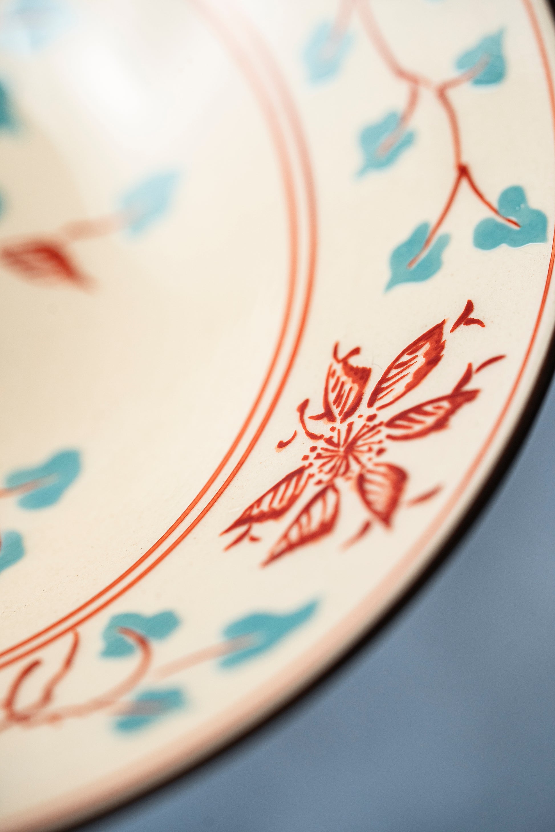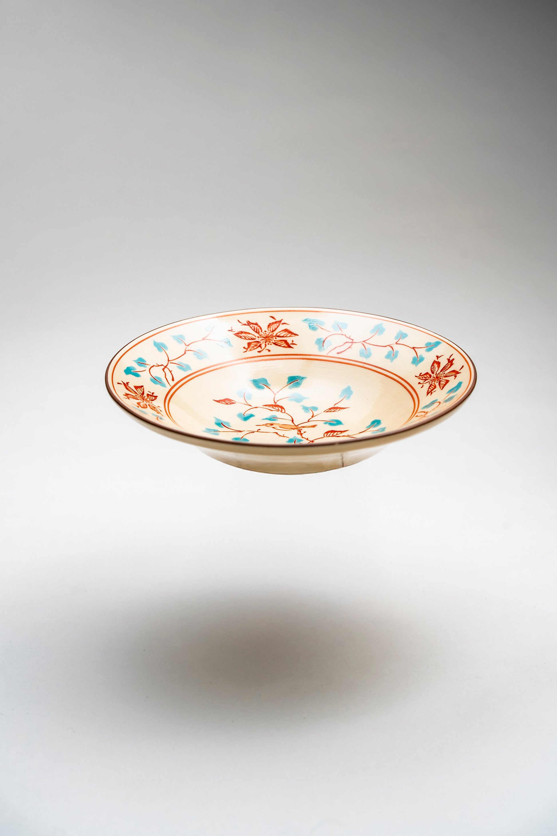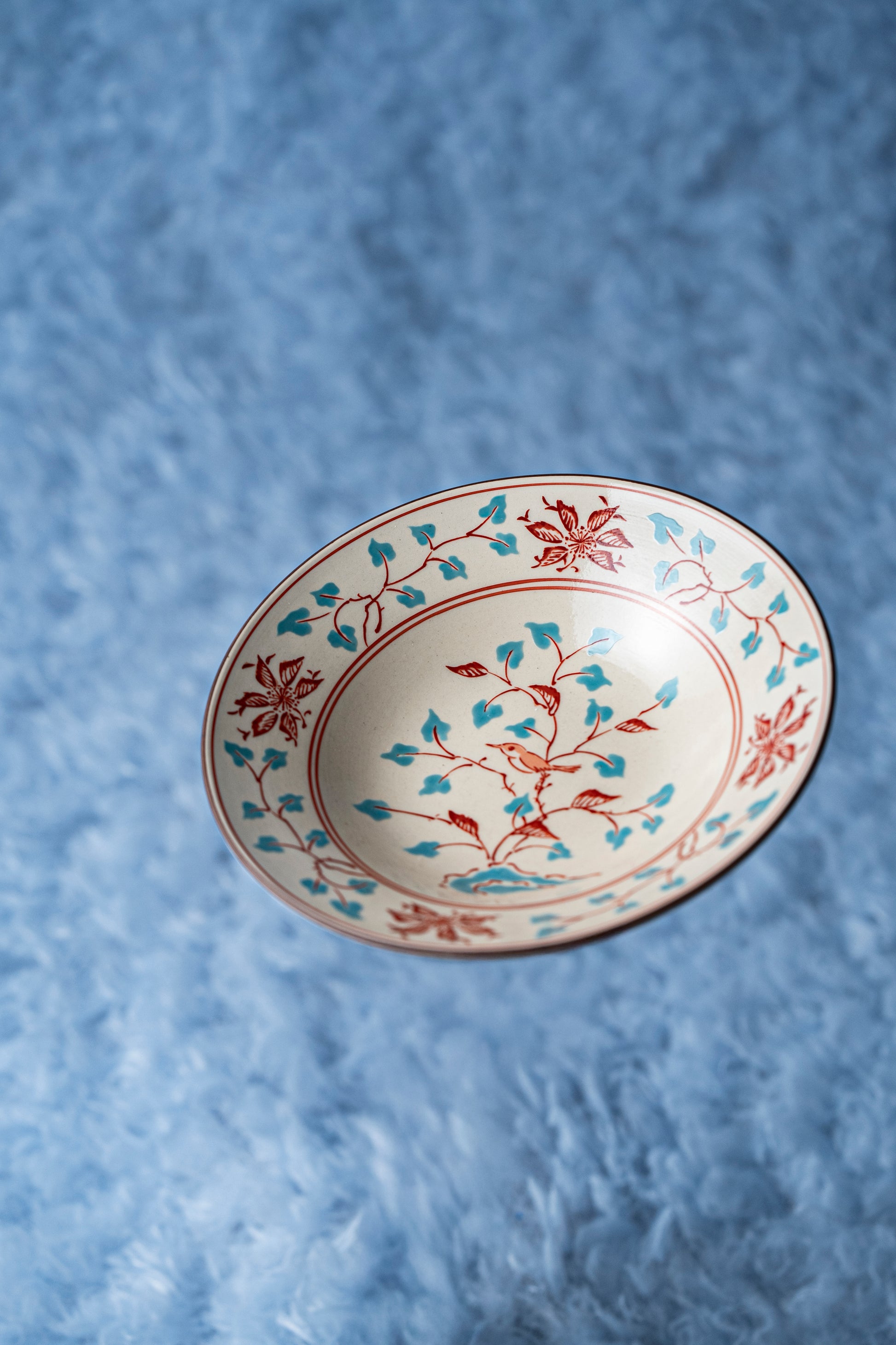 やわらかな黄味を帯びた器地に、赤と水色で花鳥を描いた華やかな深皿。繊細な筆致と落ち着いた色合いが調和し、伝統的な錦手の絵付けに上品な温かみを添えています。ほどよい深さがあり、盛り付けのバリエーションも豊富。和食の一品料理や中華の小皿など、彩り豊かな料理を美しく引き立てます。古典の意匠を現代の食卓に馴染ませた、華やかで気品ある一枚です。