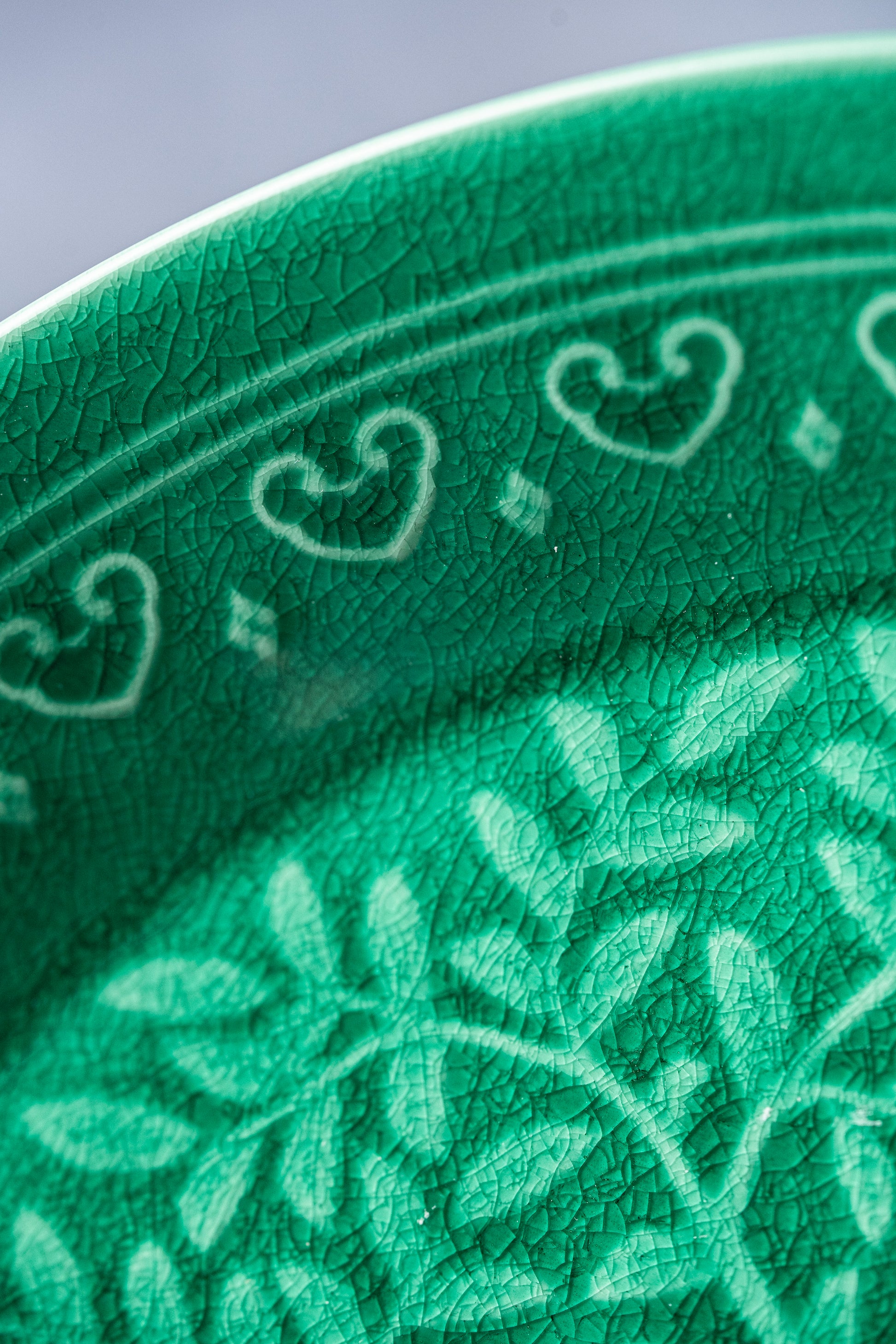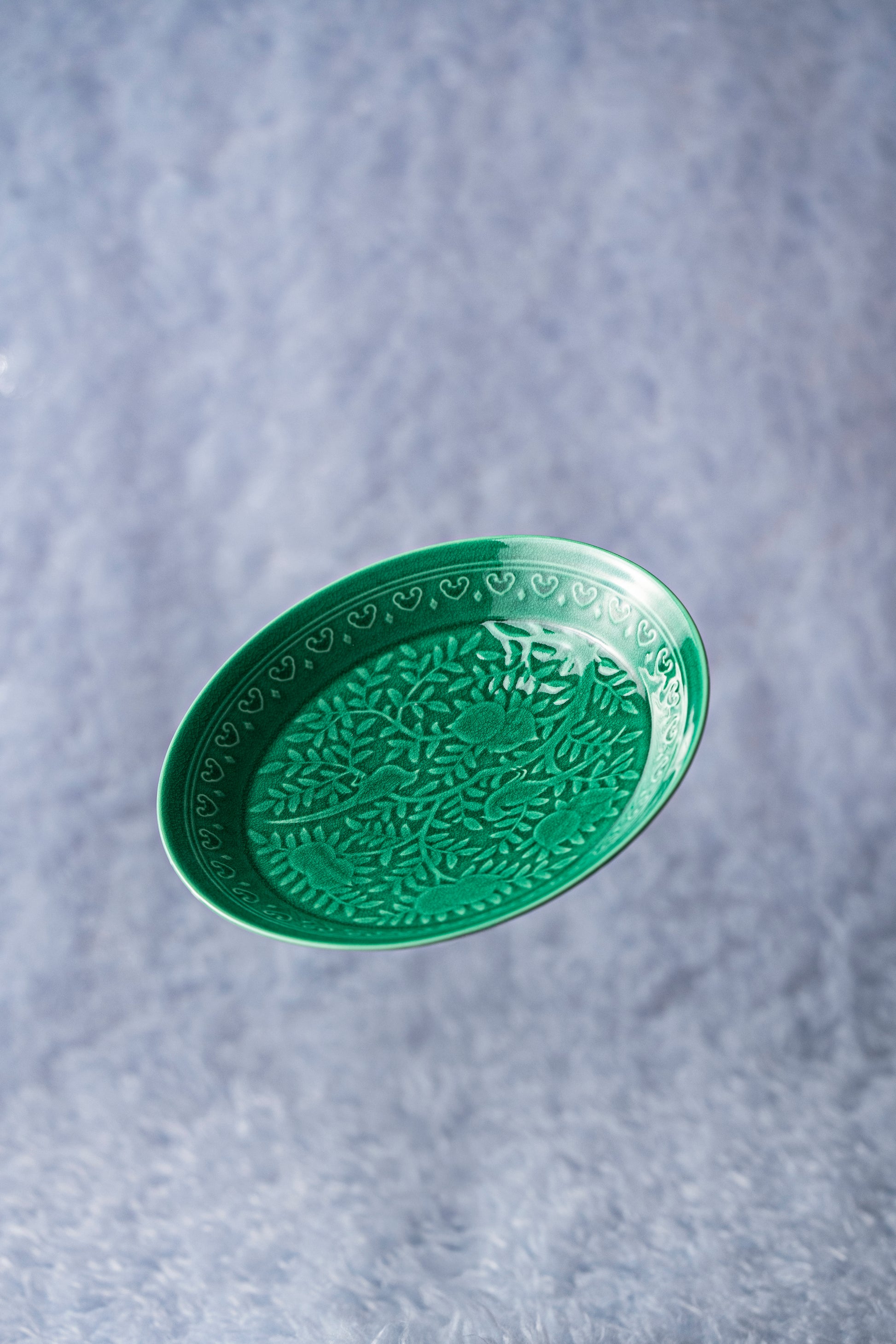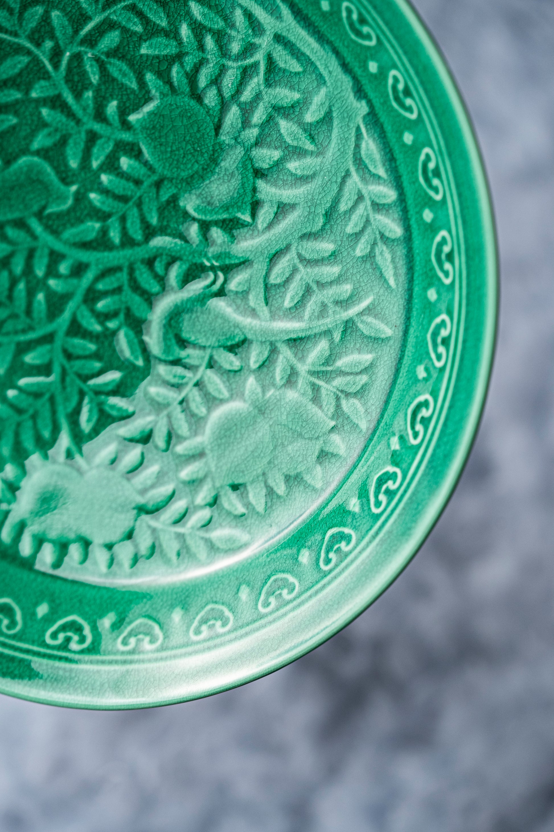 生地に絵柄が浮き出るように細工され、その上から鮮やかな緑色の釉薬を施した華やかな作品。和食やエスニック料理に特にオススメの器です。