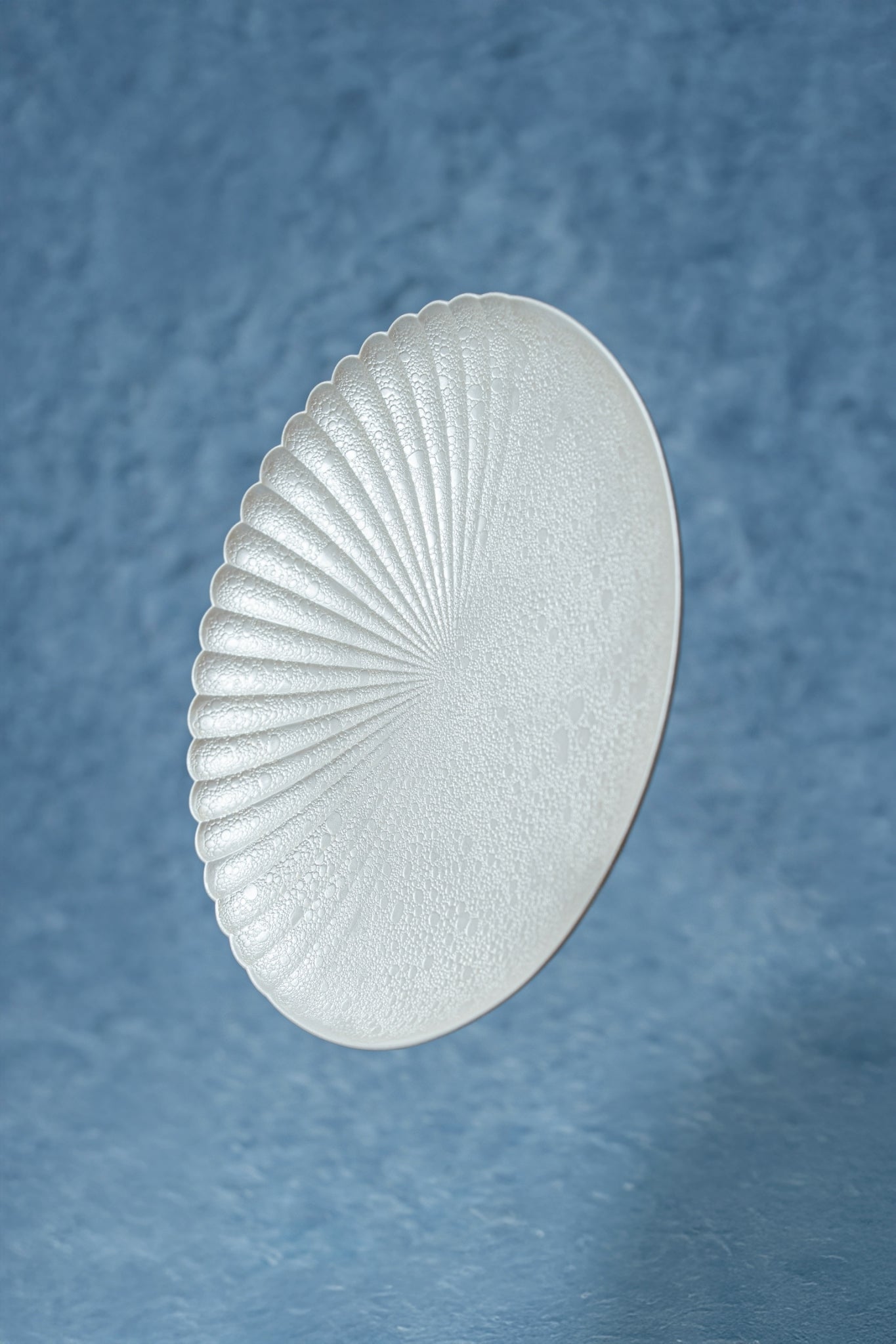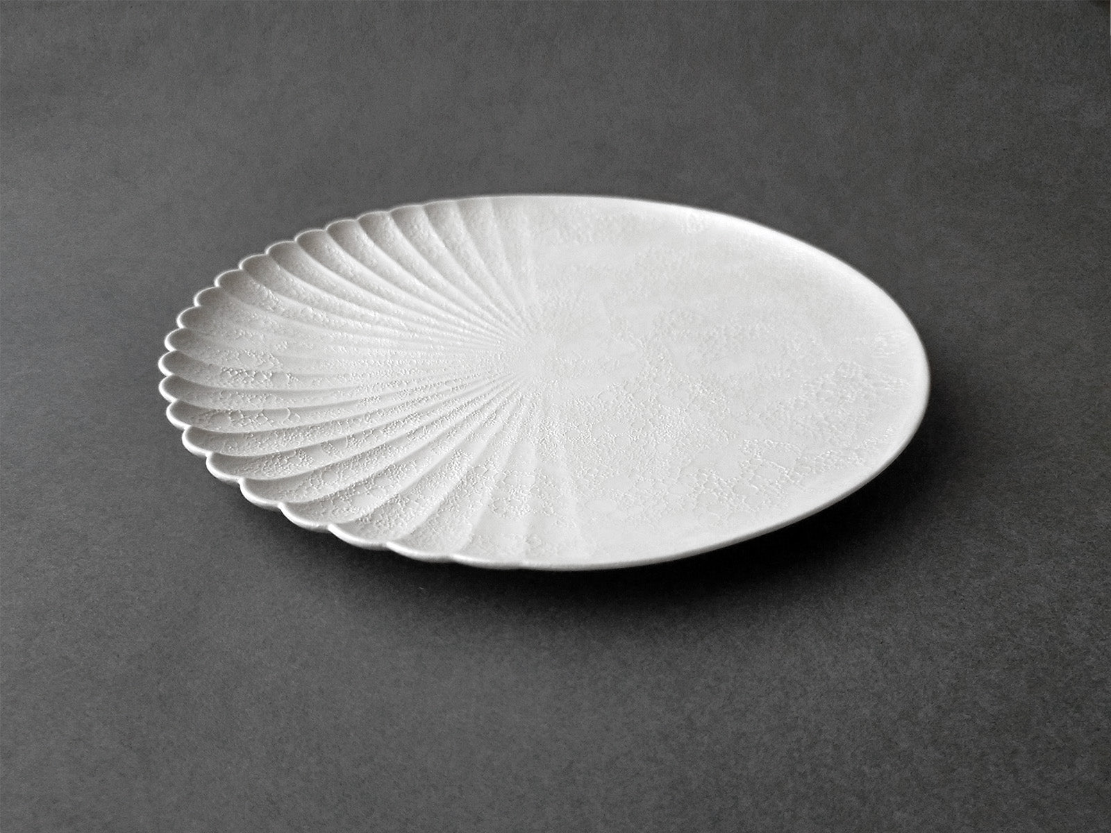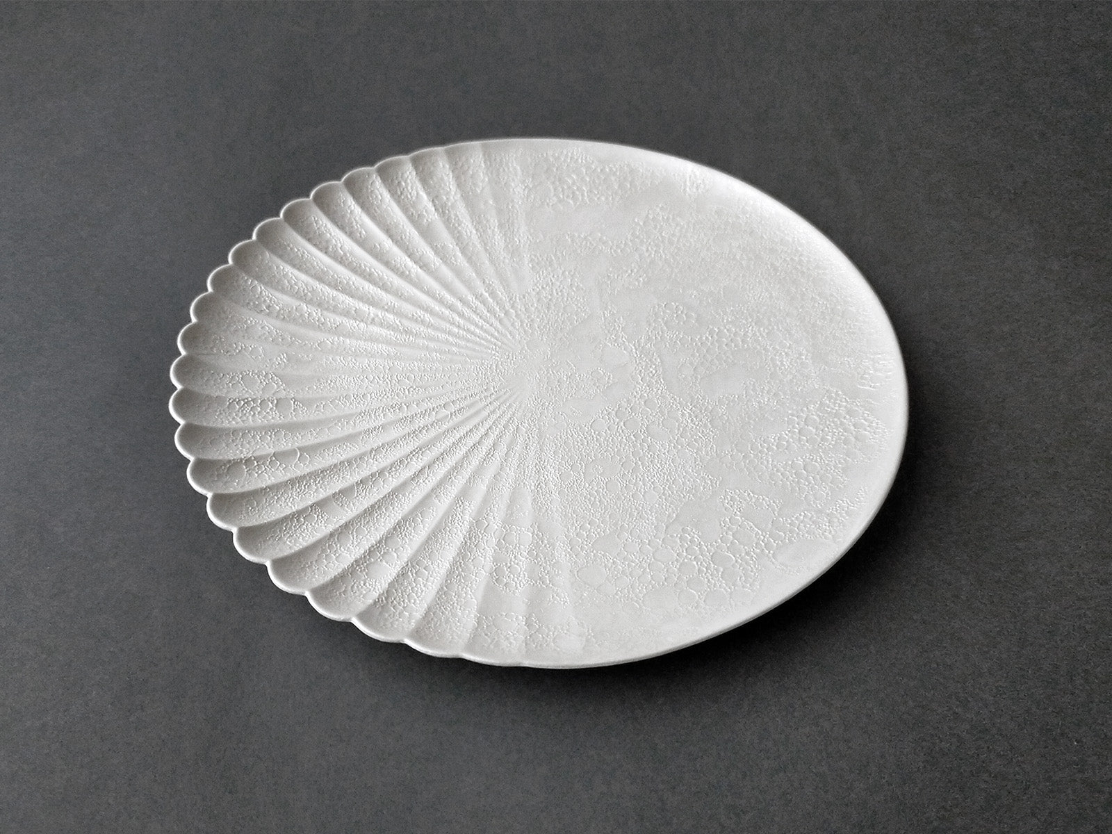 お皿の半分が菊割の形状になっており、立体感のある泡とパールホワイトの釉薬表現が高級感を演出します。
