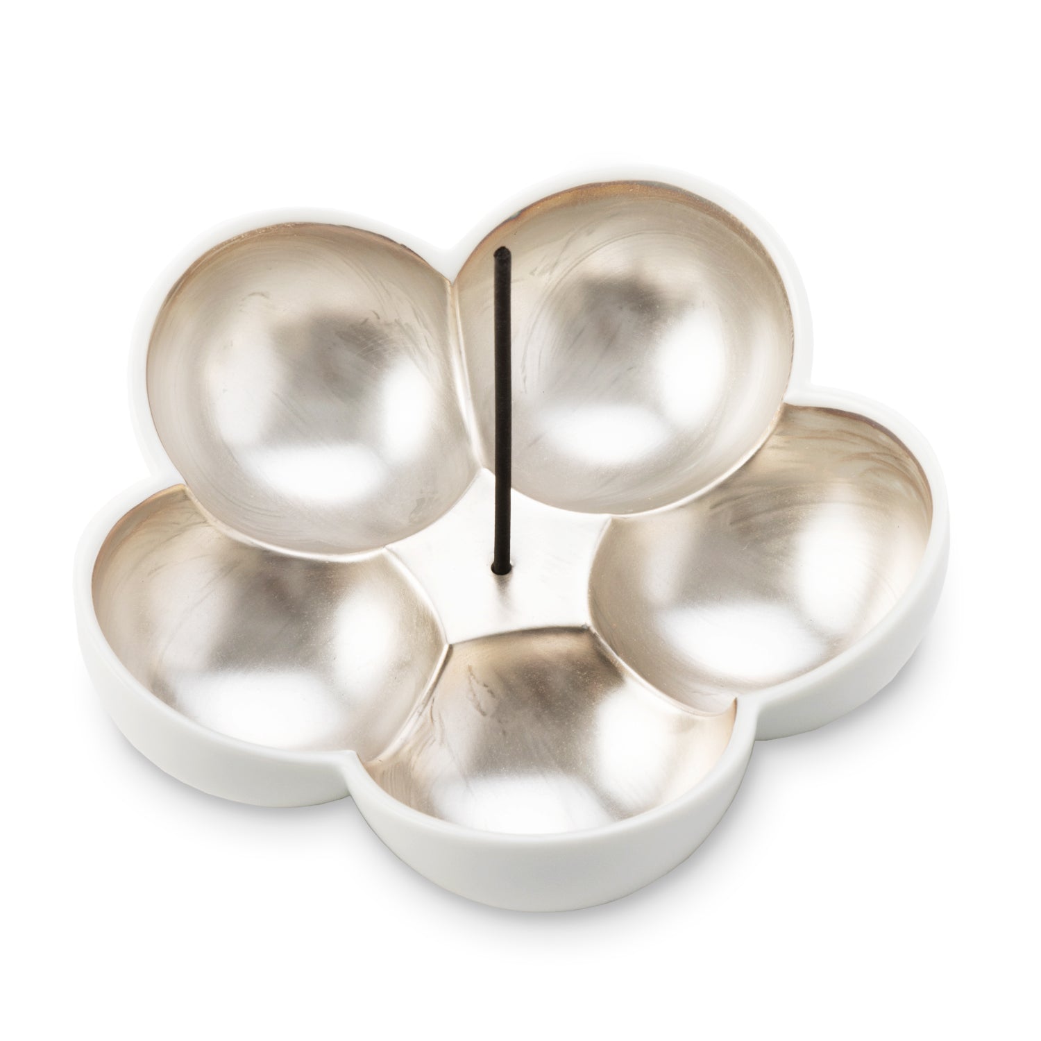 銀色の釉薬で仕上げられたモダンなお香立ては、長く使い続けることでより一層味わい深い色へと変化します。
