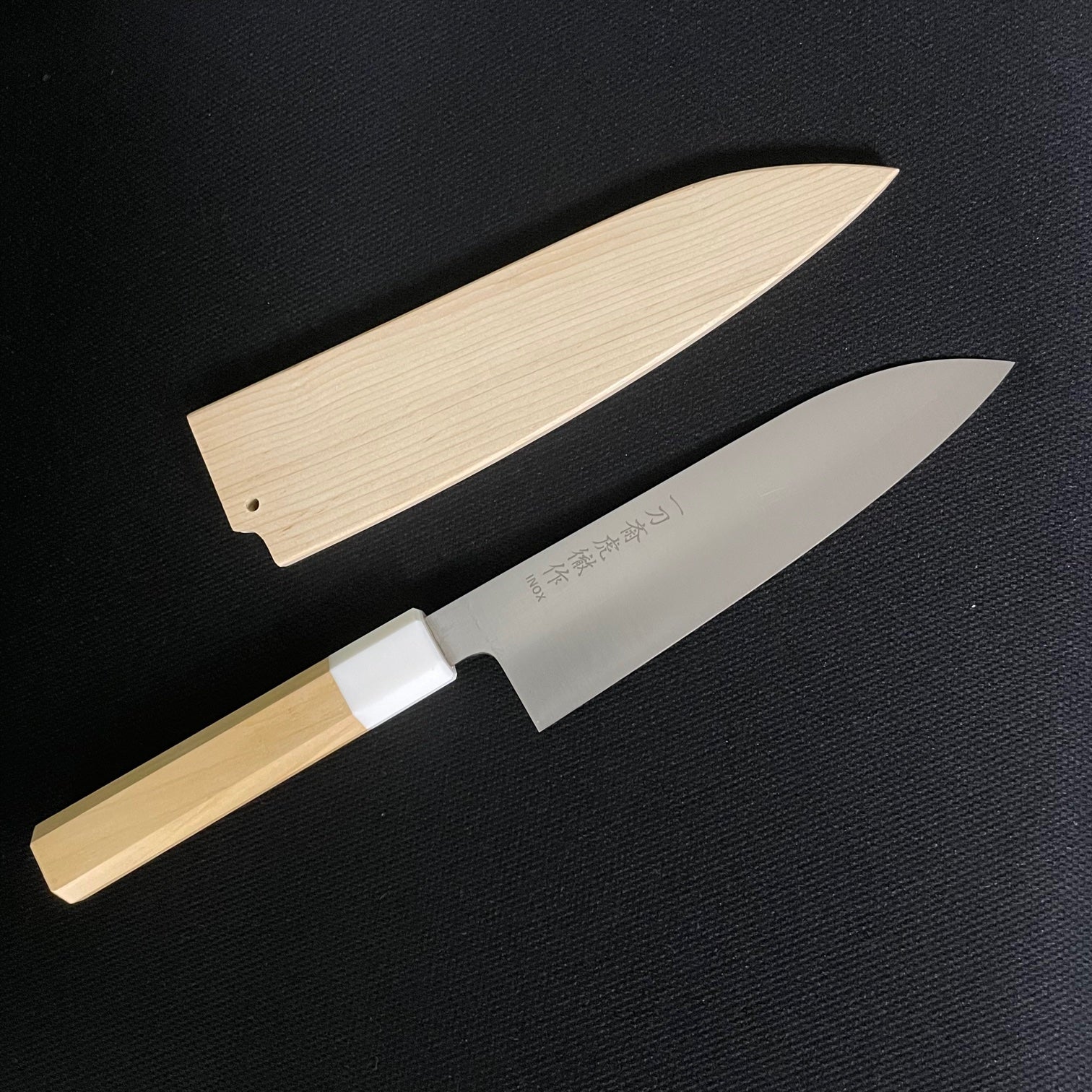 sakai kitchen〈堺キッチン〉【高橋楠】一刀齋虎徹 INOX和三徳 青森ヒバ八角人工大理石口輪柄 170mm 青森ヒバ鞘付